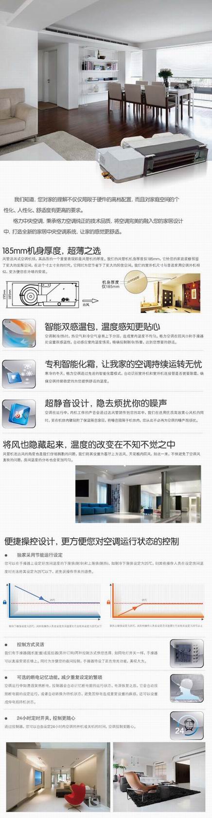 特點(diǎn):與普通分體式空調(diào)相比較,家用中央空調(diào)有著無可比擬的優(yōu)勢,(從節(jié)能上說家用中央空調(diào)直流變頻的基本能效都在國家一級以上,隱藏式風(fēng)管機(jī)能效比基本都在二級以上)它們內(nèi)機(jī)有 擁有嵌入式、卡式、吊頂內(nèi)隱藏式 落地式等十幾種樣式,每種樣式又有許多型號相對應(yīng),送風(fēng)方式可供選擇的方案要多達(dá)數(shù)百種。這就給用戶提供了很多選擇機(jī)會。它還有許多與室內(nèi)裝修相配的裝修方案供用戶選擇,能夠真正滿足用戶的個性化需求。